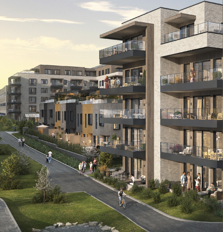 - Størrelse: 133 leiligheter, 9 rekkehus og 2 næringslokaler