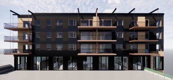 I tilknytning til det eksisterende kjøpesenter tilkommer en ny bygning langs Skårersletta, med tilgang til næringslokaler direkte fra gaten.